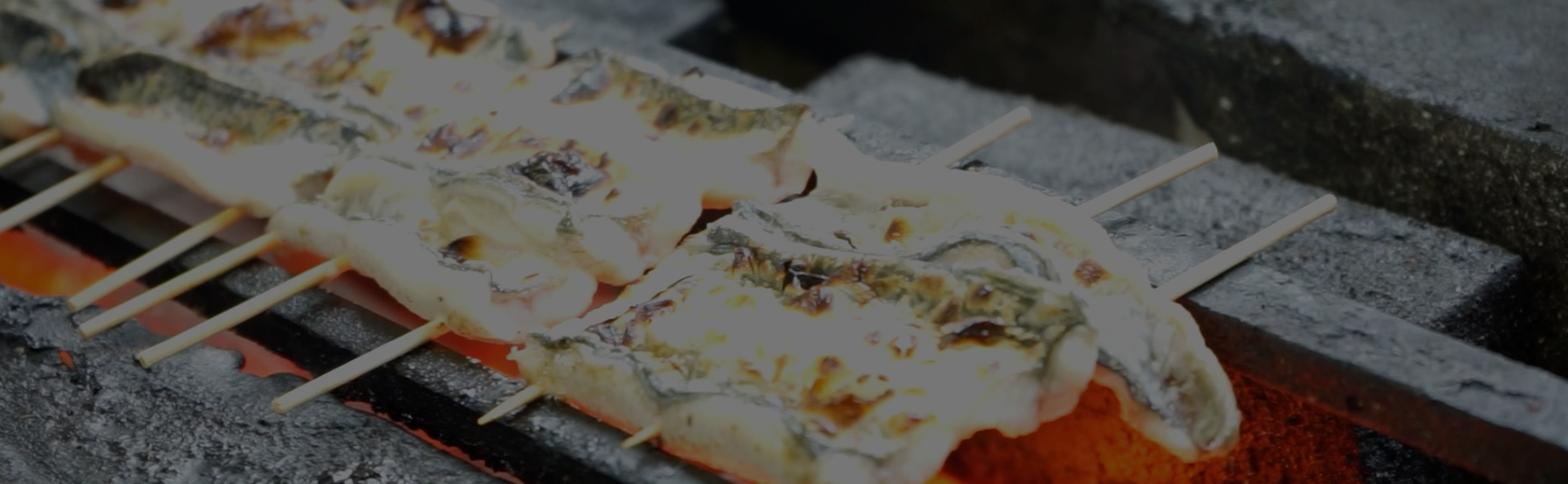 炭火はガスに比べ焦げやすいという欠点がありますが、味の面では格段に焼き上がりが良いため村田商店では炭火を使います。また血抜きをしているため、血による焼き色が付かず美しい焼き上がりの白焼きに!
